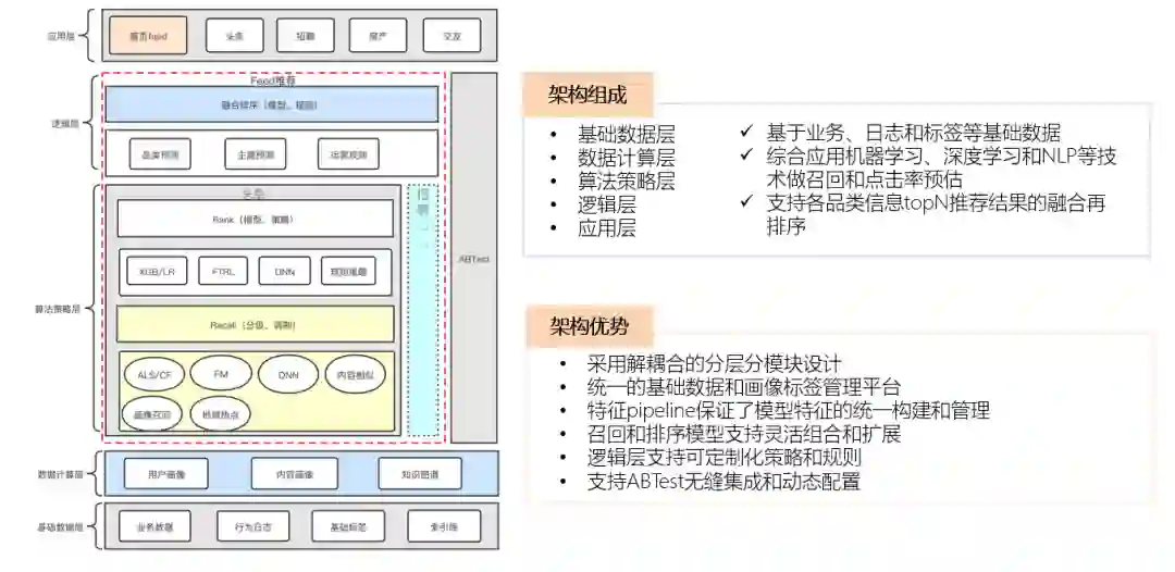 同镇推荐系统整体架构,主要包括:基础数据层、数据计算层、算法策略层、逻辑层和应用层。