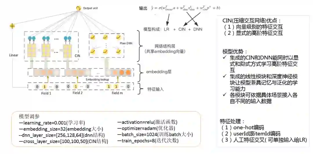 网络结构层:主要包括三部分:Linear ( 线性模型,我们采用的LR )、CIN ( 压缩交叉网络 )、DNN ( 全连接的深度神经网络 )。