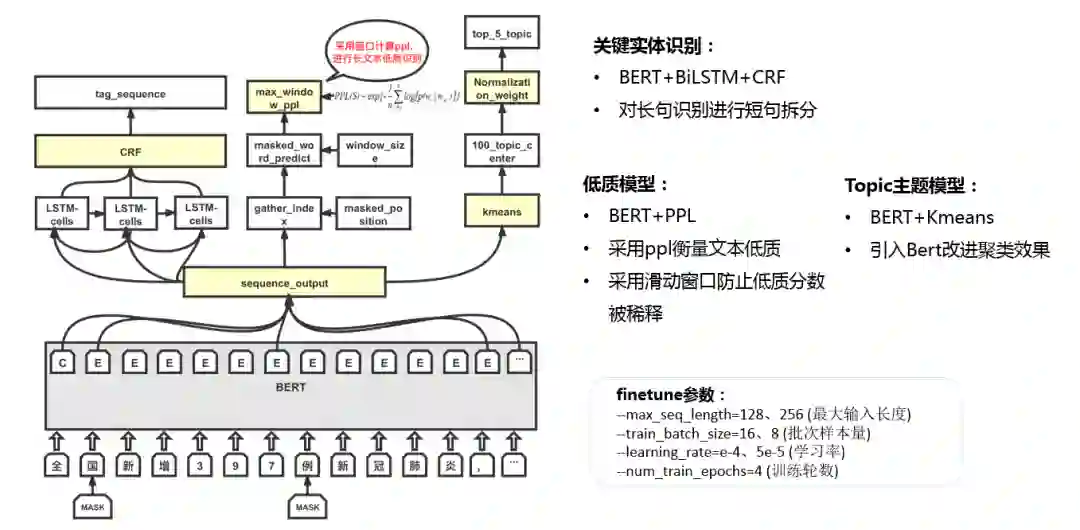 这一块主要是为了识别文本中具有能代表全文主旨的关键命名实体。我们采用的是BERT+BiLSTM+CRF的方案,这也是目前被用的比较多的一种方式。