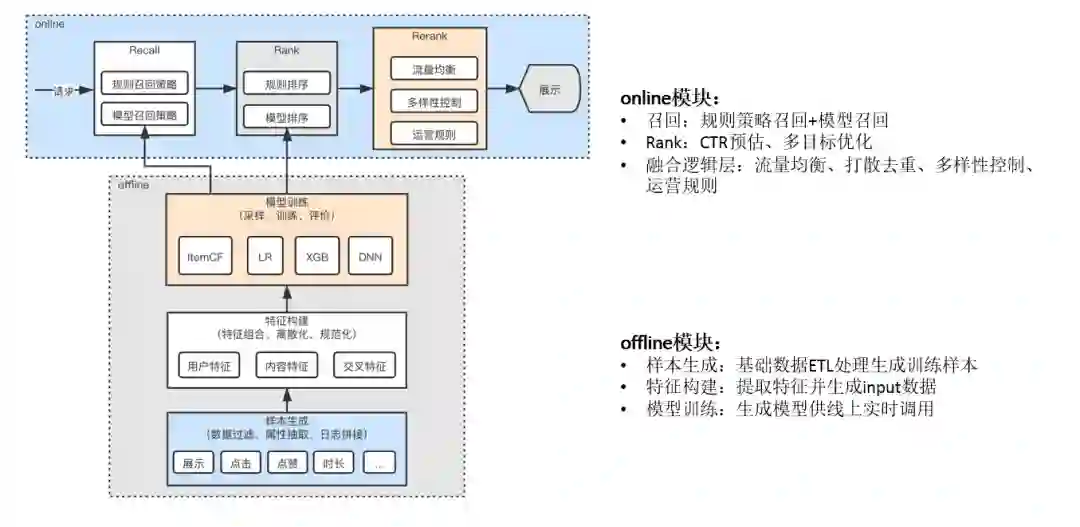 由此可见,数据和特征是重中之重,我们的数据主要包括业务数据、行为日志和标签数据。用户行为数据主要来源于埋点日志,分为显性反馈和隐性反馈两种。原始数据经过清洗、样本采样、特征组合、特征离散等特征工程的处理,最终形成训练样本并作为模型的input。