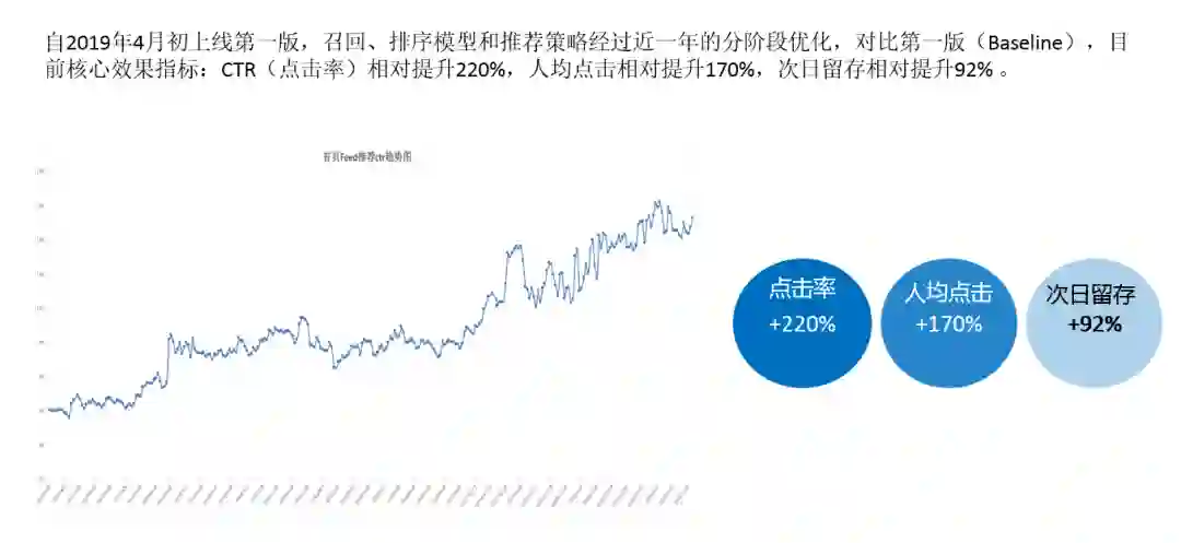 自2019年4月上线第一版,召回、排序模型和推荐策略经过近一年的分阶段优化,对比第一版 ( Baseline ),目前核心效果指标:CTR相对提升>220% ( x%->y% ),人均点击相对提升170% ( x->y ),首页Feed的次日留存提升92% ( 新老用户:x%->y% )。