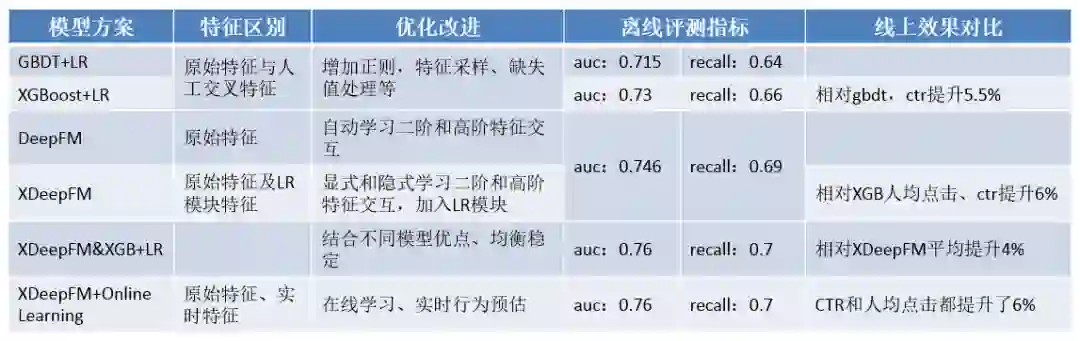 最初我们对比采用了GBDT+LR 和 XGB+LR两种组合方式,XGBoost相比GBDT在模型上做了改进和优化,不论是精度还是效率上都有了提升,从效果数据上,也可以看到auc和召回率指标都有一定的提升,线上点击率也提升了5.5%。