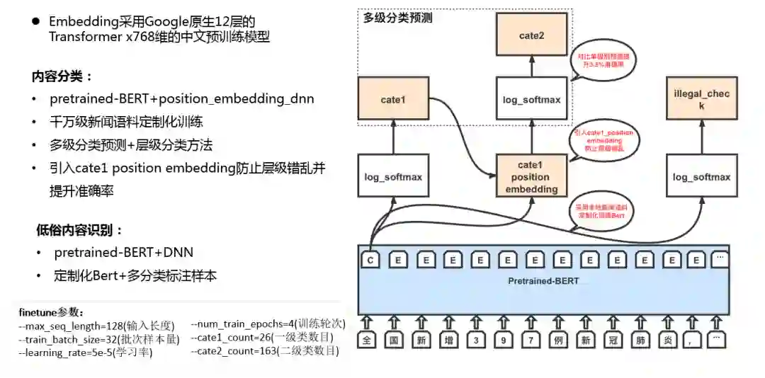 最后,在不改变网络结构的同时,我们对Bert做了定制化训练,加入了千万量级的新闻资讯语料做增量训练,由于跟原生Bert训练语料不在一个数量级上,可能只会影响最后一两层的模型参数,但是对我们的模型准确率却有2%左右的提升。