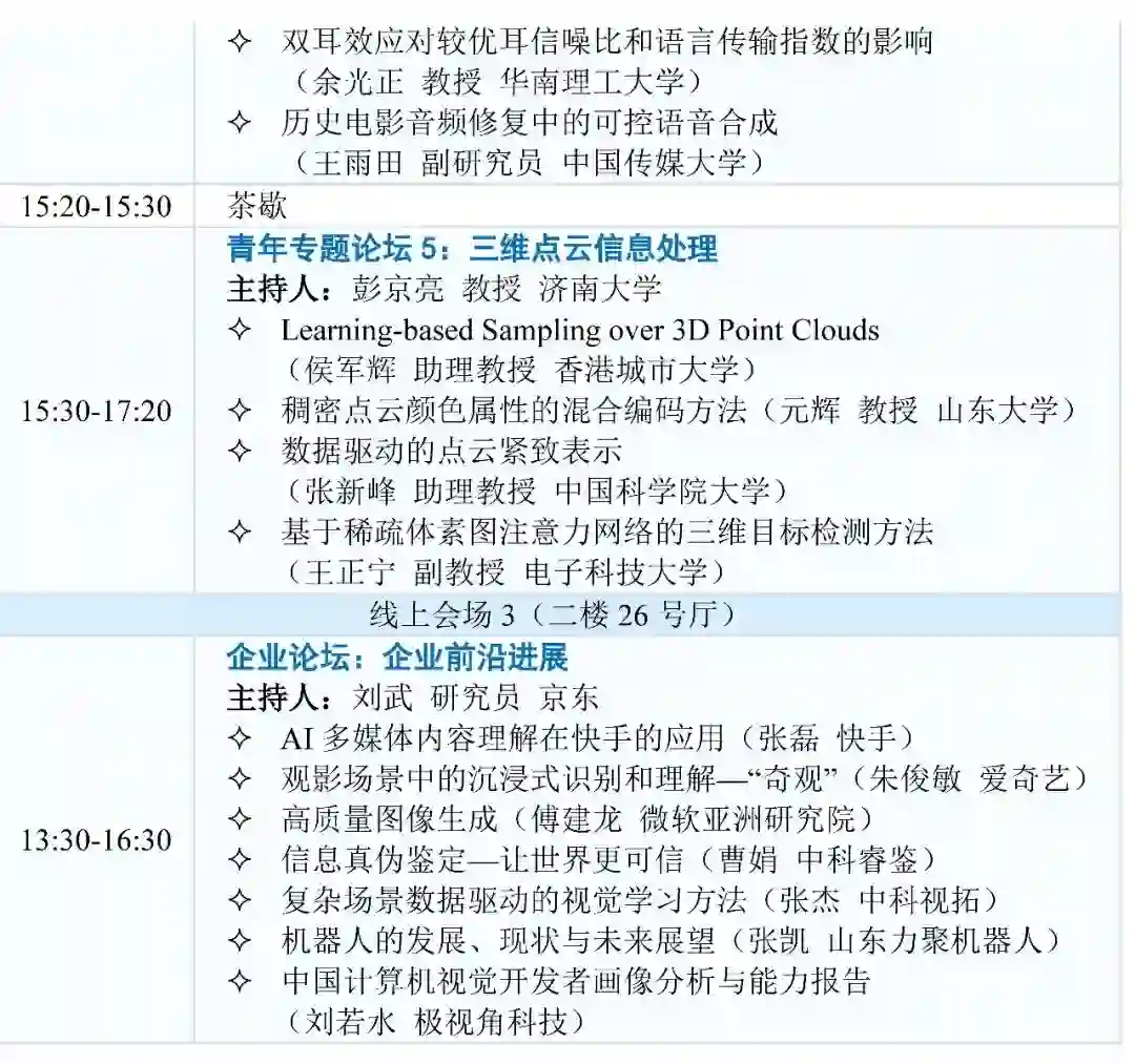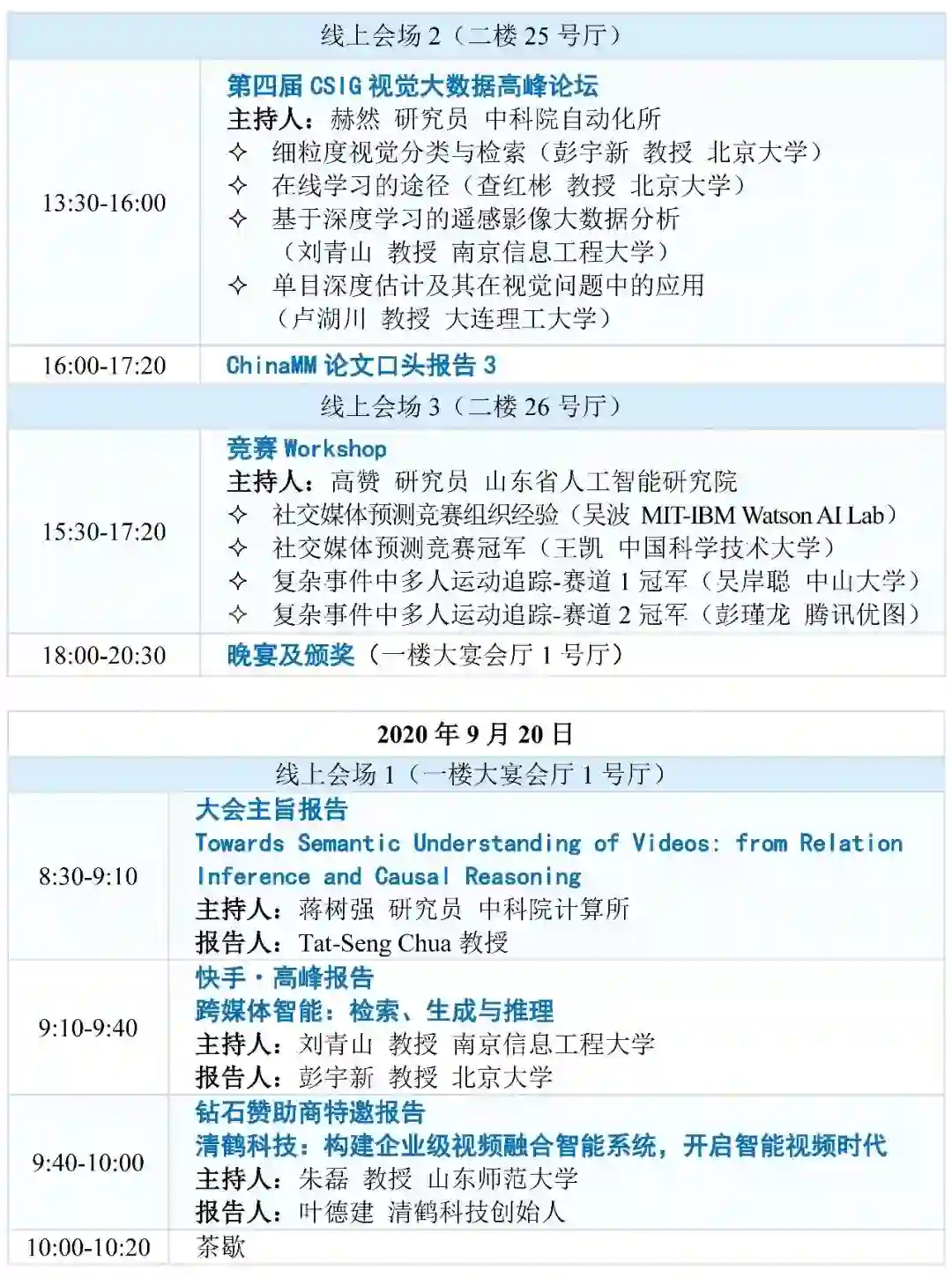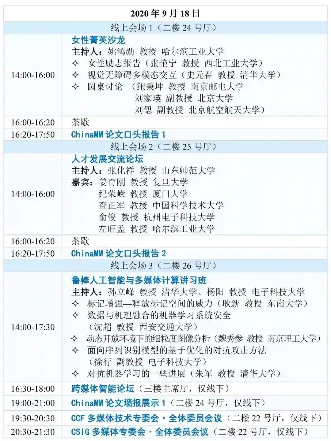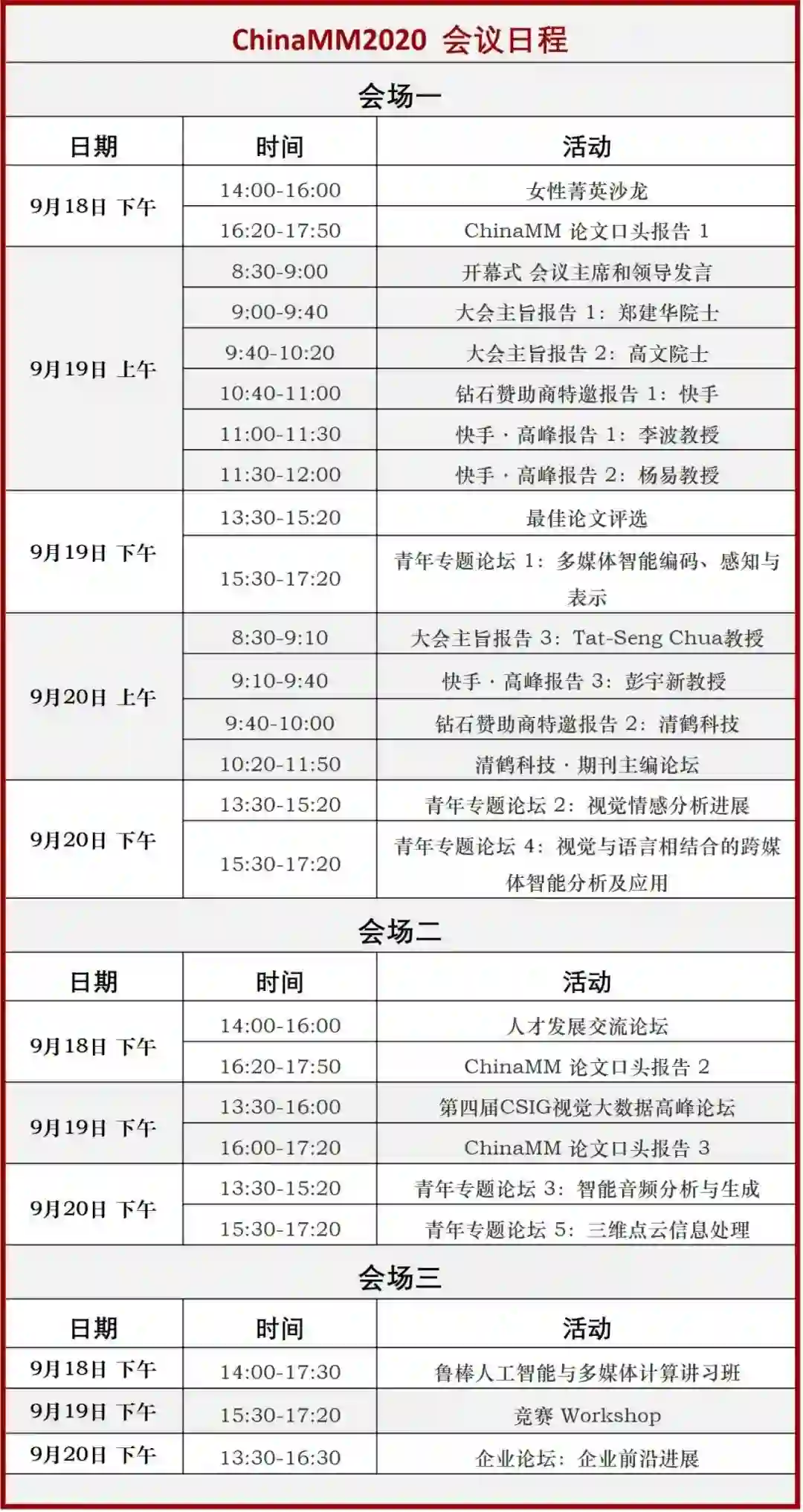 会议期间将组织:学术前沿高峰论坛、青年专题论坛、主编论坛、顶会顶刊论文分享论坛、人才发展交流论坛、女性菁英沙龙、多媒体与机器学习讲习班、企业论坛,等25场高端论坛,为参会者提供丰富的技术盛宴,全方位地扩大交流范畴,创新交流形式,增强交流实效。