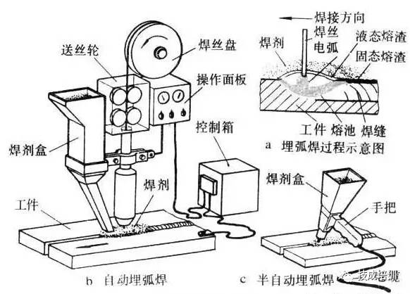 埋弧焊是以颗粒状焊剂为保护介质,电弧掩藏在焊剂层下的一种熔化极电 焊接方法。埋弧焊的施焊过程由三个环节组成:1在焊件待焊接缝处均匀堆敷足够的颗粒状焊剂;2 导电嘴和焊件分别接通焊接电源两级以产生焊接电弧;3 自动送进焊丝并移动电弧实施焊接。