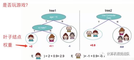 看图例右边的「tree2」,它和左边的不同在于它使用了另外的指标,出了年龄和性别,还可以考虑使用电脑频率这个划分属性。通过这两棵树共同帮我们决策当前这个人愿不愿意玩游戏,小男孩在「tree1」的权值是+2,在「tree2」的权值是+0.9, 所以小男孩最终的权值是+2.9(可以理解为得分是+2.9)。老爷爷最终的权值也是通过一样的过程得到的。