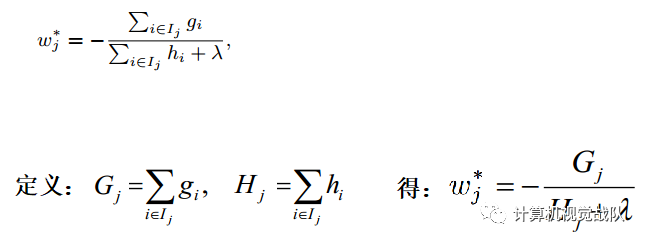 此时我们的目标是求每棵树的叶节点j的分数Wj,求出Wj后,将每棵树的Wj相加,即可得到最终的预测的分数。而要想得到最优的Wj的值,即最小化我们的目标函数,所以上式对Wj求偏导,并令偏导数为0,算出此时的W*j为: