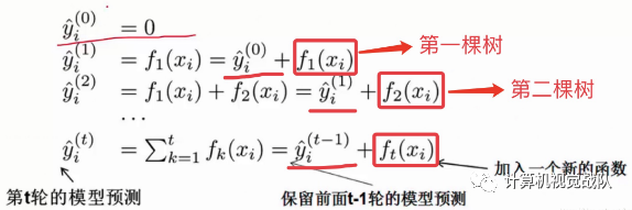 一开始树是0,然后往里面加树,相当于多了一个函数,再加第二棵树,相当于又多了一个函数...等等,这里需要保证加入新的函数能够提升整体对表达效果。提升表达效果的意思就是说加上新的树之后,目标函数(就是损失)的值会下降。