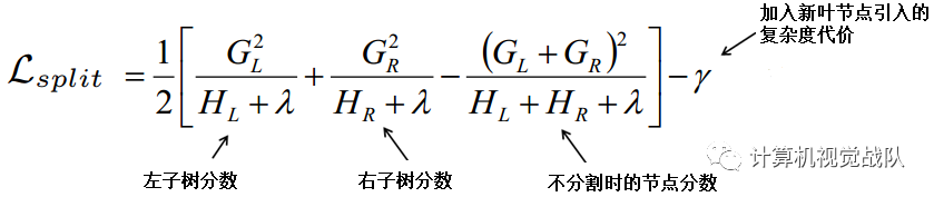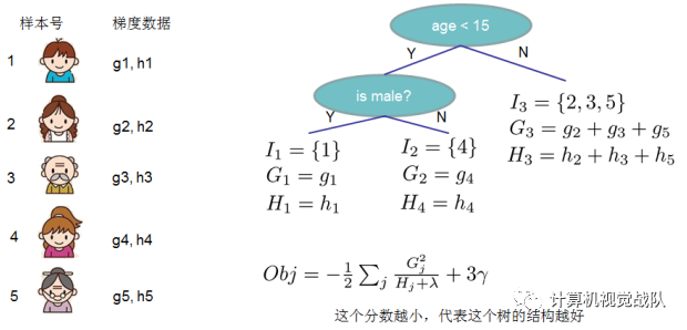 上面的方程可以用作得分(score)函数来测量树结构q的质量。该得分类似于评估决策树的不纯度得分,除了它是针对更广泛的目标函数得出的。下图表示得分(score)是如何被计算的: