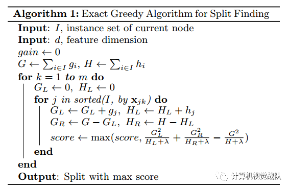 为了找到节点最好的划分,该算法的原理是在所有特征上枚举所有的可能的划分,我们称这个算法为Basic Exact Greedy Algorithm。大多数已存在的单台机器上的树提升算法库都是用这种方法实现的,例如scikit-learn,R’s gbm 以及 XGBoost的单机版本都支持这种算法。该算法要求为连续特征枚举所有可能的切分,这对计算机的要求很高,所以该算法为了有效的做到这一点,首先根据特征值排序数据并且按照顺序访问数据,以累积下面方程中结构分数的梯度统计量。