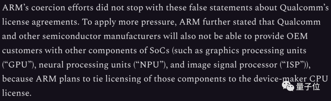 ②Arm表示,高通和其他半导体制造商将无法向OEM客户提供CPU外的其他SoC组件,包括GPU、NPU和ISP等,因为Arm计划将CPU许可证协议与这些组件的许可证协议挂钩。
