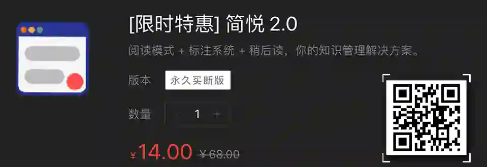 简悦 2.0 原价为 68 元,限时折扣价为 14 元。