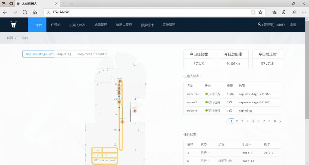 首先,蚁群调度 2.0 系统是交互的纽带,智慧物流的大脑。其主要功能是对多台机器人进行任务分配,智能监控,交通管理,通讯管理,能效分析等。系统通过给机器人选择最优路径。通过完善的交通管制、虚拟道路,可以灵活解决岔口拥堵,同时提高整个机器人工作的效率。用户可通过控制台对受控机器人发布相应的控制指令,包括启动、停止、调速等。系统同时提供整个系统的运行情况,实时显示各机器人状态等。
