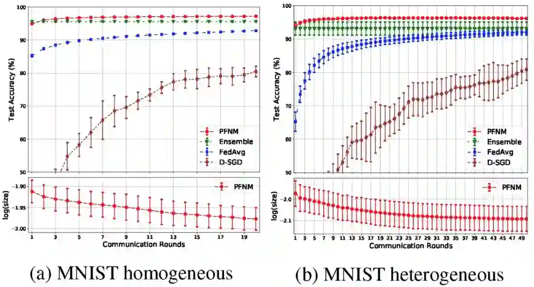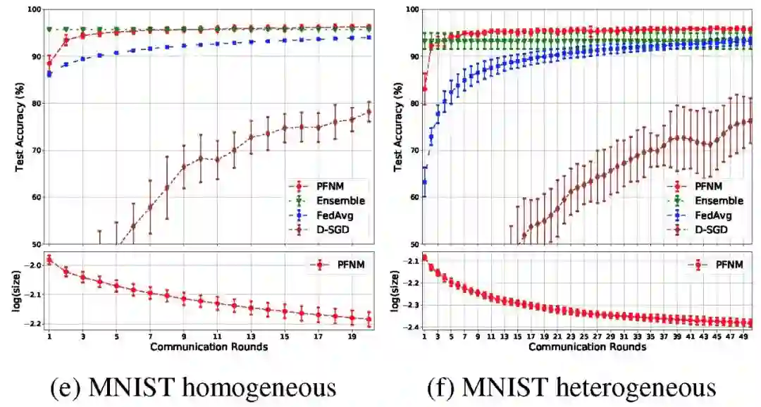 图 4 给出了一层和两层神经网络的结果。在两种实验数据情况下,每层都使用 100 个神经元。在保证足够通信回合的情况下,PFNM 的性能都优于聚合算法。此外,在所有的实验中,与联邦学习和 D-SGD 相比,PFNM 需要较少的通信回合就能达到给定的性能水平。