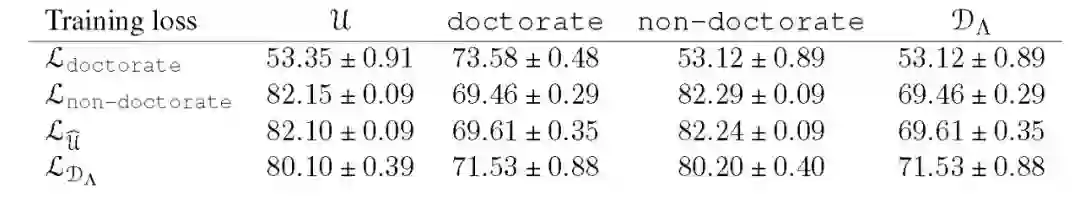 利用 UCI 机器学习库的人口普查数据集构建成人数据库,共 32561 个训练样本。根据是否获得博士学位,将训练样本划分为两个域,其中博士域包括 413 个样本,非博士域包含 32148 个样本。基于类别特征和 Adagrad 优化器训练得到 Logistic 回归模型。表 1 列出了平均运行 50 次以上的模型性能。使用 u^训练得到的 D_lambda 代表经典联邦学习方法的结果,而使用 L_D_lambda 训练得到的 D_lambda 表示 AFL 效果。在所有模型中,AFL 在最差的域内获得最高的准确度 (71.5%)。AFL 模型的测试准确度在各域上的平均值略低于经典的均衡化处理模型,但不可知论模型的偏差较小,在 D_lambda 上表现较好。在本文实验的两个域中,博士域更难预测。对于这个领域,领域不可知模型的性能接近于仅基于博士域数据的模型,优于经典均匀分布模型。
