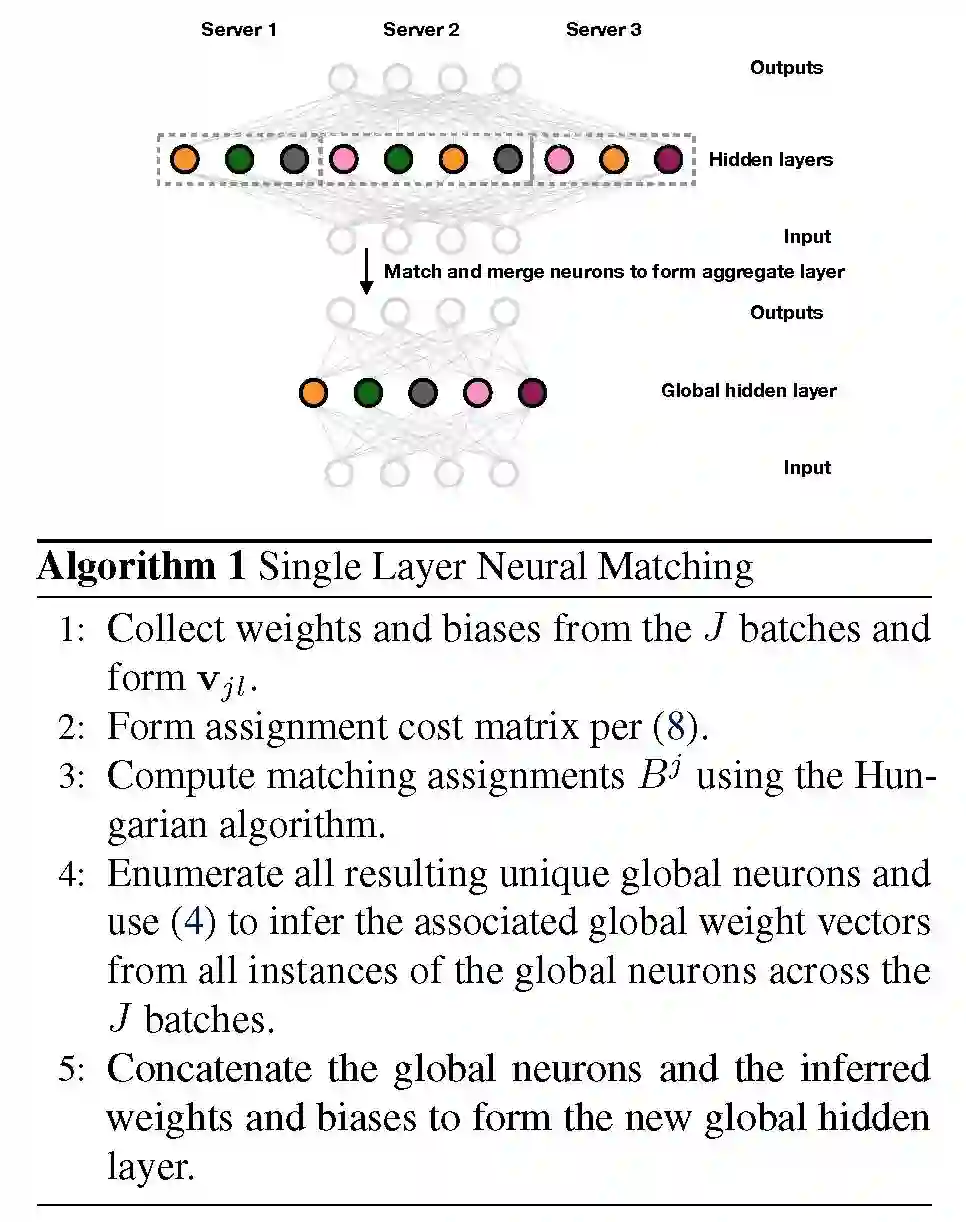图 2 中的节点表示神经元,相同颜色的神经元表示相互匹配。左侧图显示了其中一层的匹配方法,具体为:使用下一个最高层的匹配分配将每个 j 批中的神经元转换为引用全局上一层的权重向量。使用这些权重向量形成代价矩阵,之后使用 Hungarian 算法进行匹配。最后,对匹配的神经元进行聚集和平均,形成全局模型中新的一层。如图 2 中右图所示,在多层设置中,生成的全局层用于匹配下一个较低层等,直到到达底部隐藏层。