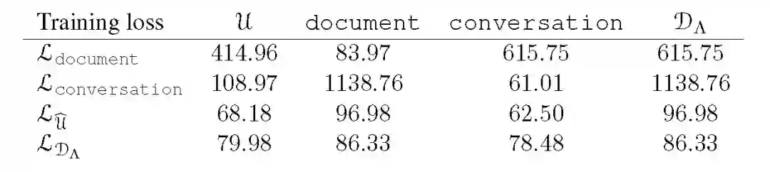 该数据库仅包含两种语言数据:对话和文本。对话数据使用的是 Cornell 电影数据库,其中包含了 300000 条语句,平均长度为 8。文本数据使用 Penn TreeBank(PTB)数据库,包含 50000 条语句,平均长度为 20。本文通过将上述两个对话和文本语料库作为域相结合构建了一个数据库。本文使用动量优化器(momentum optimizaer)训练了一个投影大小为 512 的双层 LSTM 模型。通过复杂度来衡量模型的效果,即交叉熵损失的指数,实验结果见表 3。在这两个域中,文本域的处理难度较大,AFL 的测试复杂度接近于仅针对文本数据训练的模型,优于基于均匀分布 u^训练的模型。