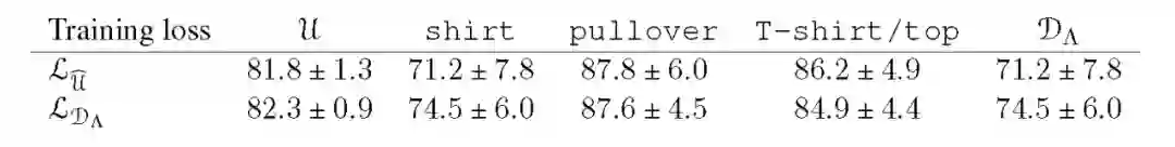 MNIST 数据库包含 60000 个训练图像和 10000 个测试图像,以 28x28 个灰度像素强度阵列的方式存储,同时在 10 个类别中均匀分布。本文首先训练一个简单的逻辑回归分类器,观察到以下三个类别的分类性能最差:T 恤衫/上衣、套头衫和衬衫。接下来,提取了用这三个类别标记的数据子集,并将该子集分成三个域,每个域由一类衣服组成。然后,使用逻辑回归和 Adam 优化器训练针对这 3 个类别的分类器。实验结果见表 2。由于各个域分别给定了标签,在这个实验中,本文没有对比在特定域上训练的模型。在 3 个类别中,衬衫的分类难度最大。与基于均匀分布 u^训练的经典模型相比,AFL 可以提高衬衫类别的整体识别准确度。此外,不可知学习方案不仅改善了难度最大的域内的识别效果,而且具有更好的推广性,提高了平均测试准确度。AFL 模型在任何目标分布 D_lambda 上达到了约 74.5% 的准确度,而经典联邦学习的准确度约为 71.2%。
