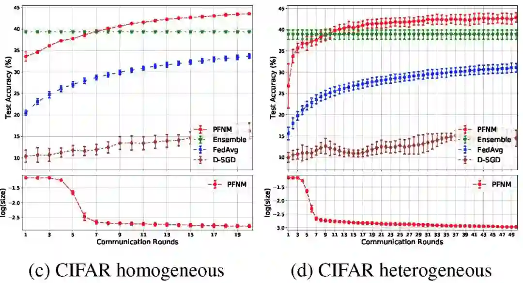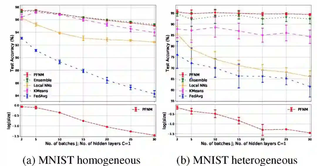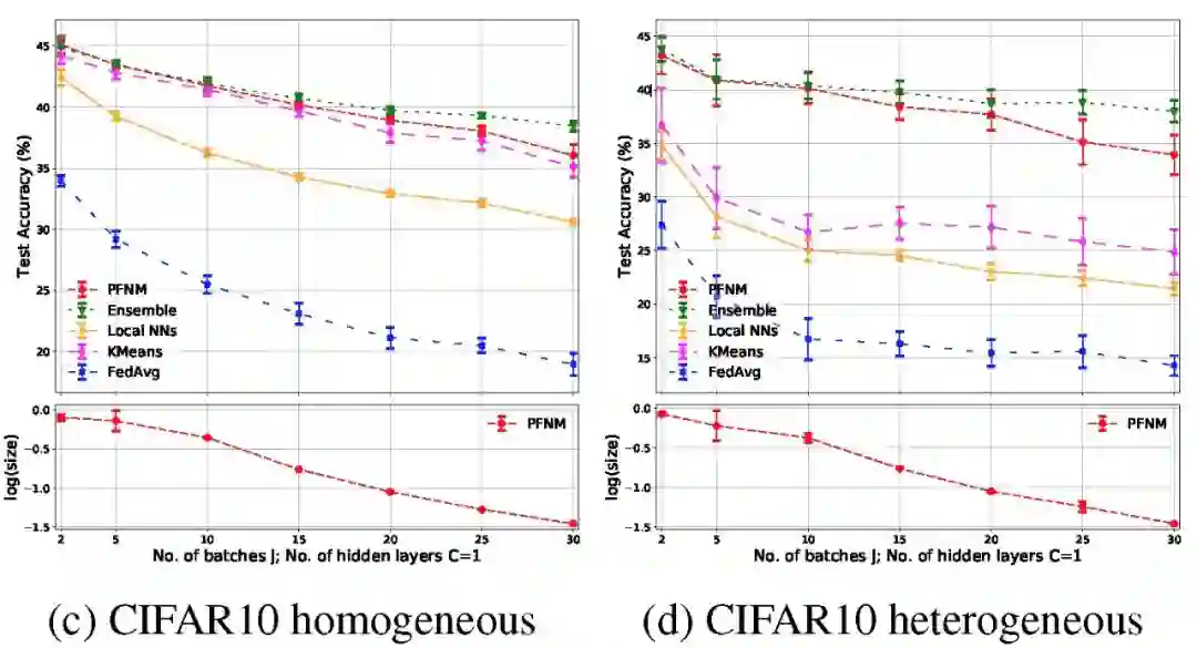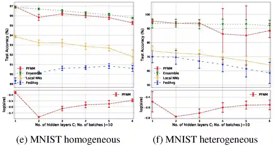 图 3 给出了不同批次的单隐层神经网络结果。在异构分区的实验条件下,我们观察到局部 NNS 和 K-means 的性能明显下降,而 PFNM 能够保持其良好的性能。在讨论聚合性能的问题上,PFNM 与本地模型和联邦学习方法相比,改进也很明显。但是它的性能略逊于聚合方法,特别是针对 CIFAR-10 中较深的网络结构。此外我们也能看到,因为经典联邦学习方法的思路就是通过多轮通信构建全局模型,因此仅执行一轮通信回合,联邦学习方法的效果最差。