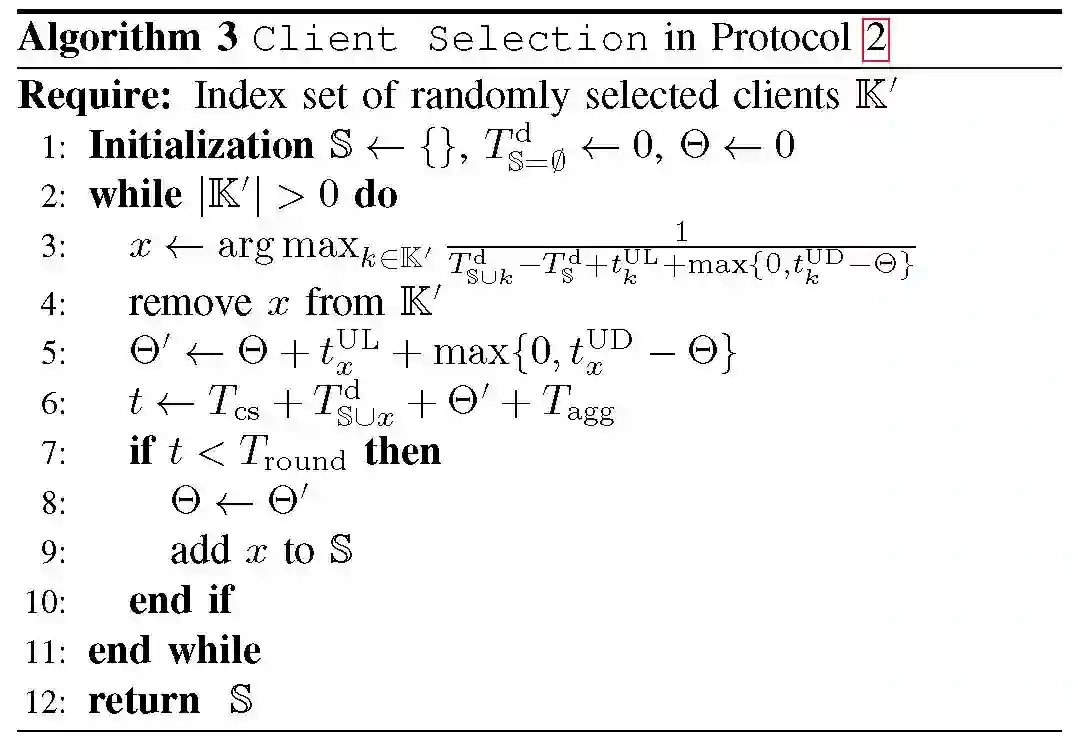 将模型上载和更新操作所用时间最少的客户端迭代添加到 S,直到运行时间 t 达到截止时间 T_round。整个算法中最关键的参数为 T_round,本文将 T_round 设置为较大值,从而能够保证更多的客户端参与到每轮上载和更新中。