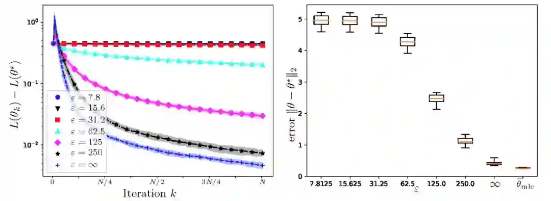 实验结果:具体实验结果见图 2 所示。其中左图给出私有随机梯度法的误差,正如上文所分析,私有随机梯度法对这个问题是(极大极小)最优的。随着 epsilon 值变大,实验效果逐渐接近于非私有化处理的经典随机梯度估计方法。右图给出随机梯度方法和非私有最大似然估计的误差方框图。