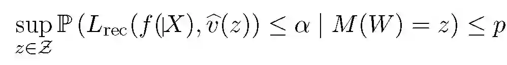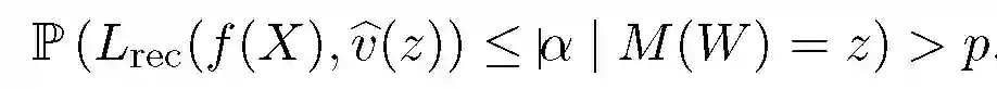 旁观者(或对手)具有先验知识 pi,已知随机映射机制 M:W→Z, W→Z=M(W)。f 为重建目标,L_Rec 为损失函数。估计值 v.^提供一个针对 L_Rec 的 (alpha,p,f) 重建破坏如下: