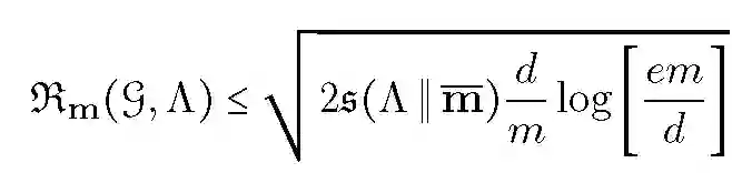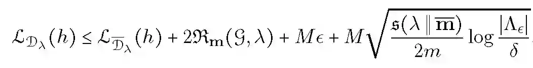 其中 Sk 表示大小为 m_k 的样本,sigma 为 Rademacher 变量集合,这些变量均为 {-1,+1} 范围内的均匀分布随机变量。假设损失函数以 M>0 为界。对于任何大于 0 的 delta,在样本 Sk~Dk.^(m_k) 中以最小(1-delta)的概率抽样,具有下列不等式: