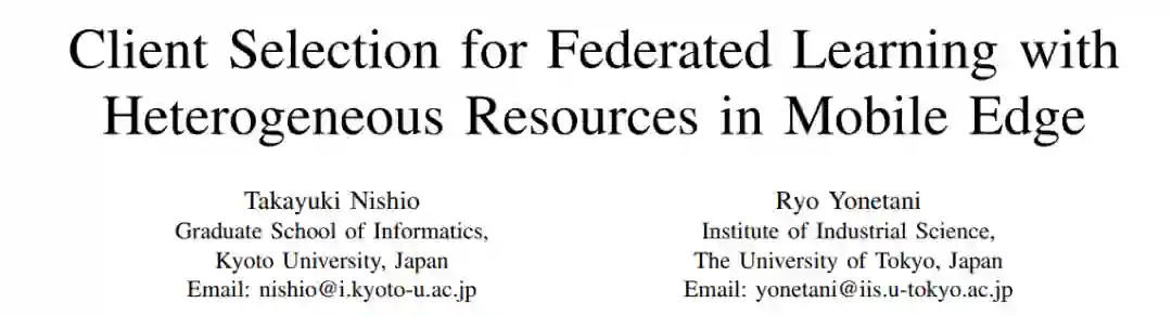 https://arxiv.org/abs/1804.08333,Client selection for federated learning with heterogeneous resources in mobile edge, 提出了一个用于机器学习的移动边缘计算框架,它利用分布式客户端数据和计算资源来训练高性能机器学习模型,同时保留客户端隐私;
