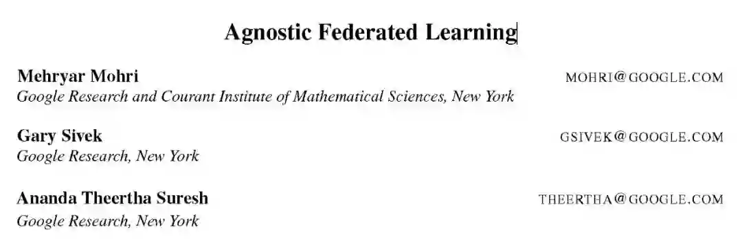 https://arxiv.org/abs/1902.00146v1,Agnostic Federated Learning,解决之前联邦学习机制中会对某些客户端任务发生倾斜的问题;