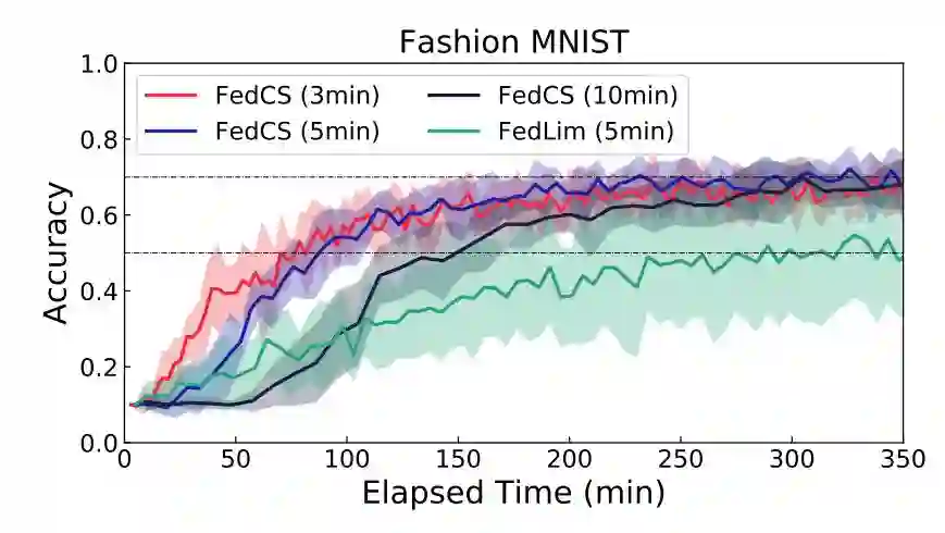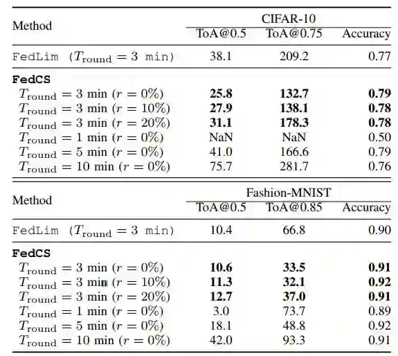 4)评价指标:本文将 FedCS 与经典联邦学习方法(FedLim)进行对比。评价指标包括达到所需精度的时间(ToA@x)、最后期限后的准确度(Accuracy)。