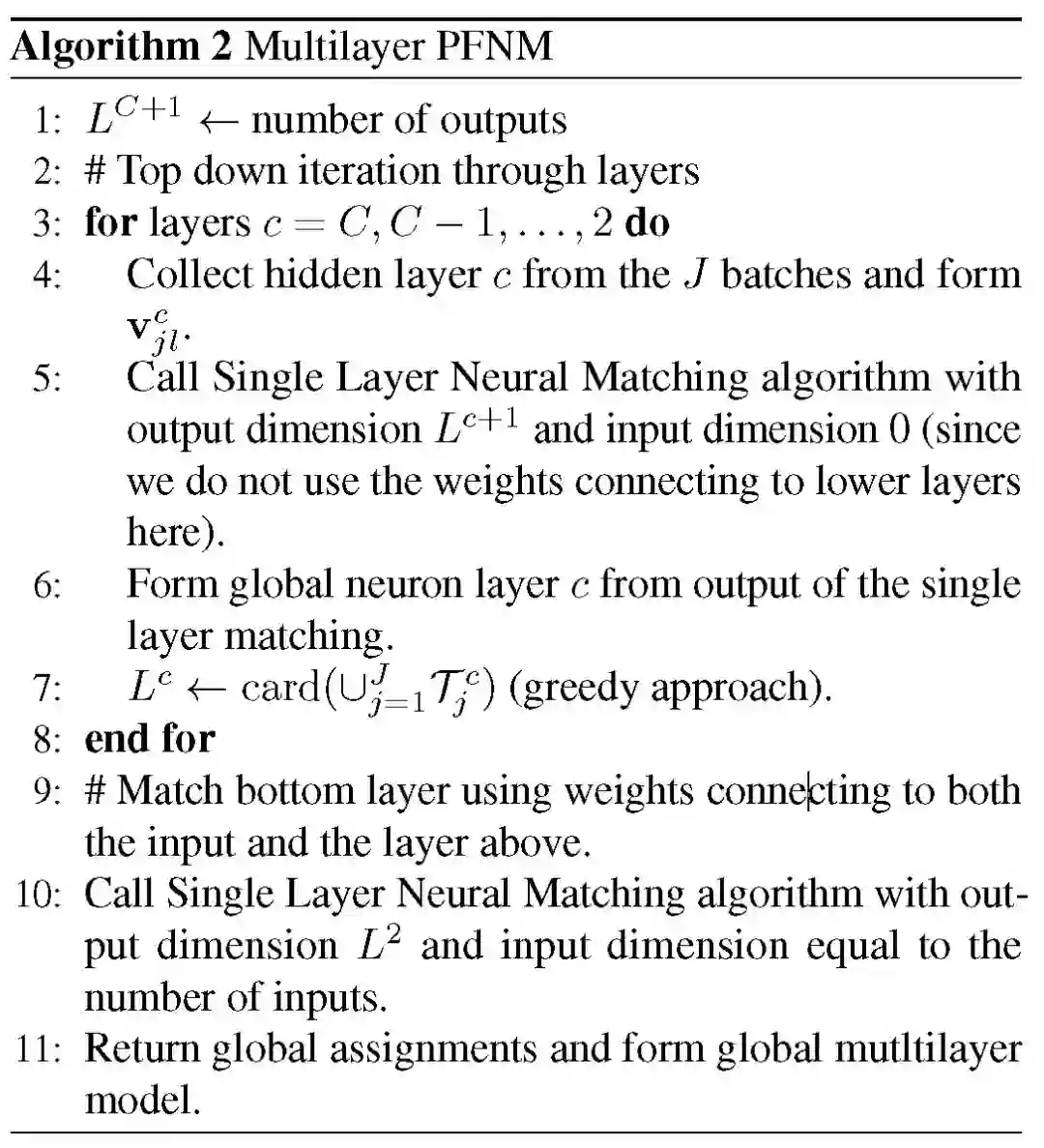 遵循自上而下的生成模型,本文采用贪婪推理过程,首先推断出顶层的匹配,然后再向下进行网络层的匹配。每个层的生成过程仅依赖于其上一层中的全局神经元的类别和数量,因此,一旦推断得到全局模型的 C+1 层,就可以将单层推理算法(如图 1 中的算法 1)应用到第 C 层。也就是说,只需要一轮通信,就可以生成全局模型。图 2 直观地说明了整个多层推理过程,算法 2 提供了详细信息。