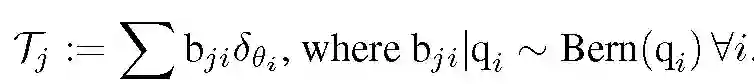 其中每个 theta_i 是由特征提取器权重偏差对与 softmax 回归的相应权重形成的级联向量。本文使用「batch」来表示数据的一个分区。接下来,对于每个 j=1,...,J,通过 Bernoulli 过程为 batch j 选择全局原子的子集: