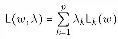而本文提出的不可知联邦学习 AFL 框架,其目标分布表征为分布 Dk 的未知混合,其中各个混合项的权重为 lambda。因此,AFL 中的不可知损失函数为: