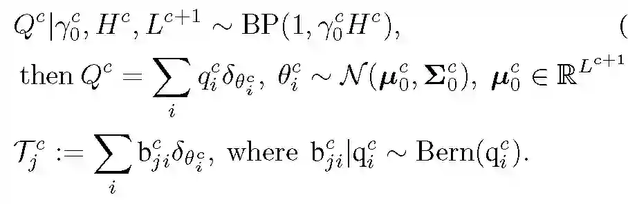 从最上层的隐藏层 c=C 开始,我们使用与单层情况中相似的模型生成每个层,基于各层结果生成一个全局原子集合,并使用 Beta-Bernoulli 过程构造为每个批(batch)选择一个子集。L 对应某层神经元的数目,它控制对应层原子的尺寸。多层模型的生成过程如下: