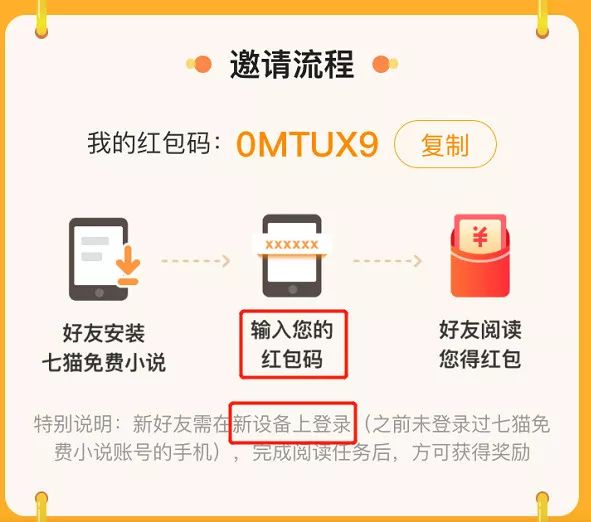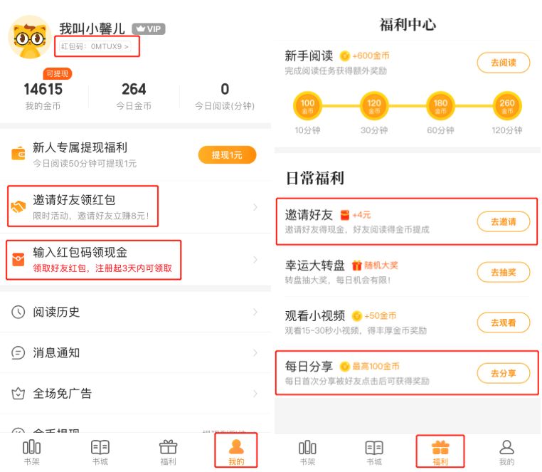 通过红包码邀请用户,不管是发到群里还是单独发给朋友,都能够获得邀请现金,而邀请的好友如果完成了阅读动作,老用户不仅可以获得现金分红,还有10%的金币提成,这套流程包含了标准的裂变元素。