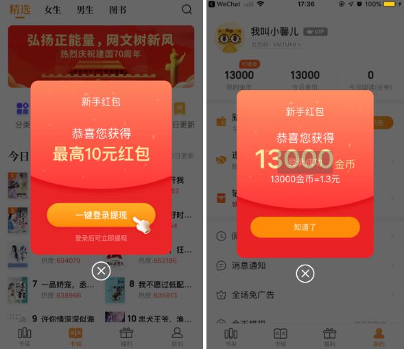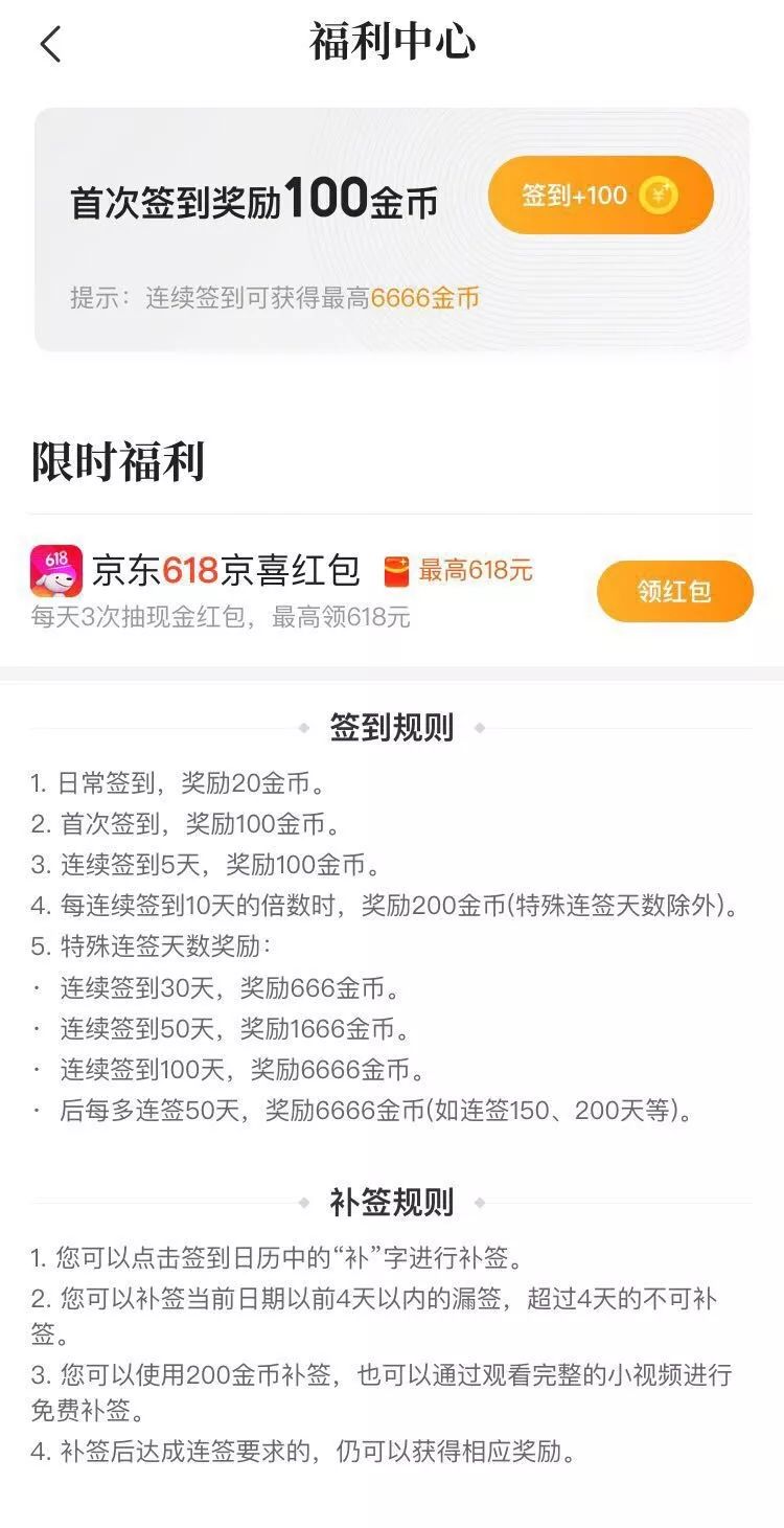 对于新用户来说,首先,注册登录可以领红包。这一步的操作会有弹窗强提醒,把福利直接摆在用户面前。按照官方的说法,一次最多可以领到10w金币,也就是10元,而这个金额是可以立即提现的。