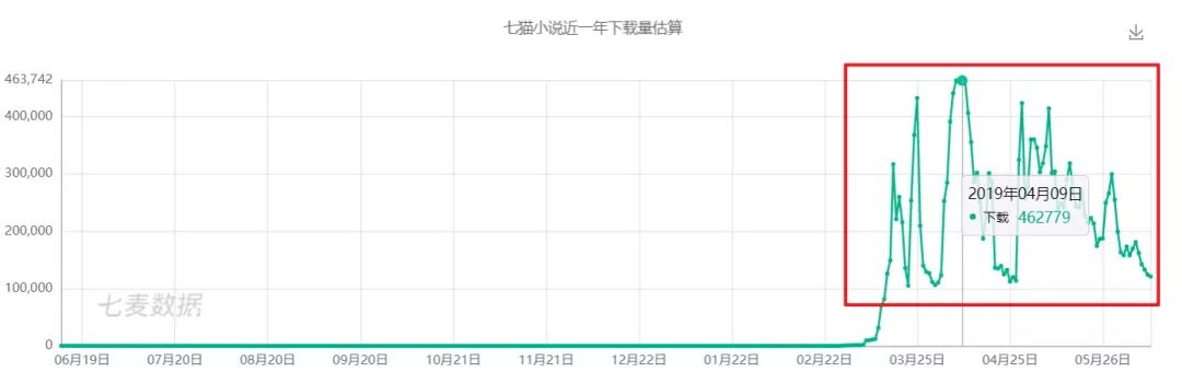 从下图下载量曲线可以看出,从3月份开始,七猫小说的日下载量开始急剧上升,最高的日下载量达到了40w+,现在仍在总榜TOP30,图书榜TOP3。