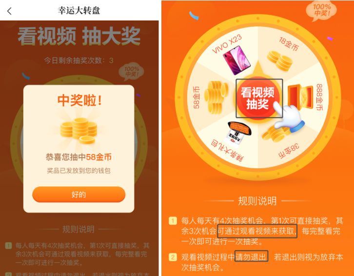 这个任务融合了变现,每天有4次抽奖机会,而后3次都需要观看15-30s的小视频才能获得,目前的视频广告主要为游戏和同类型新闻App,相对来说更契合人群画像,转化率相对更高。