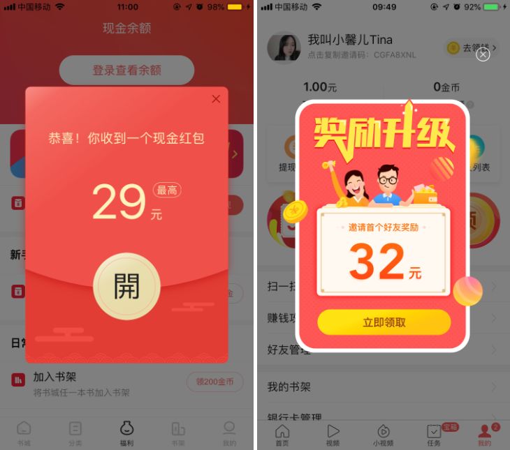 对比同类产品,番茄小说也采用了同样的套路,进入App后点击福利Tab出现了弹窗提醒,不同的是它最高可以获得29元。