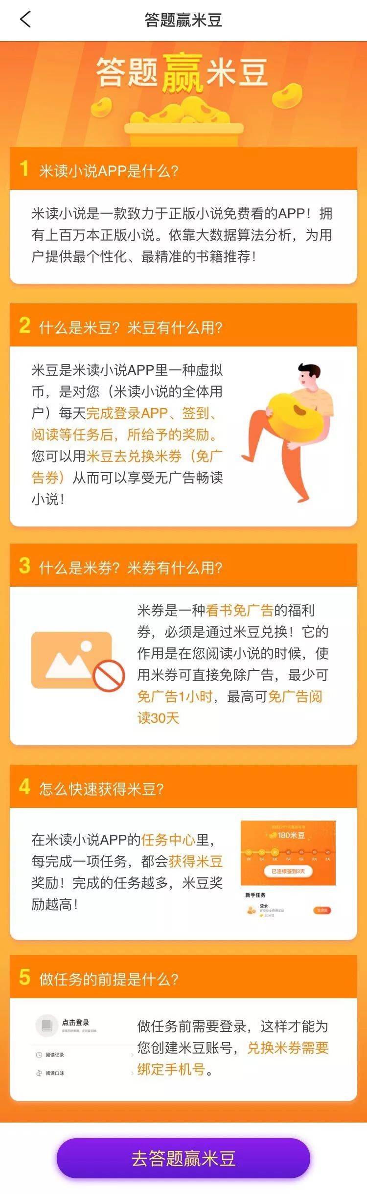 而同样的答题玩法也出现在了米读小说里,米读小说重的“米豆”类似于金币,不同的是,它不直接与现金挂钩,而是可以兑换成免广告的米券。
