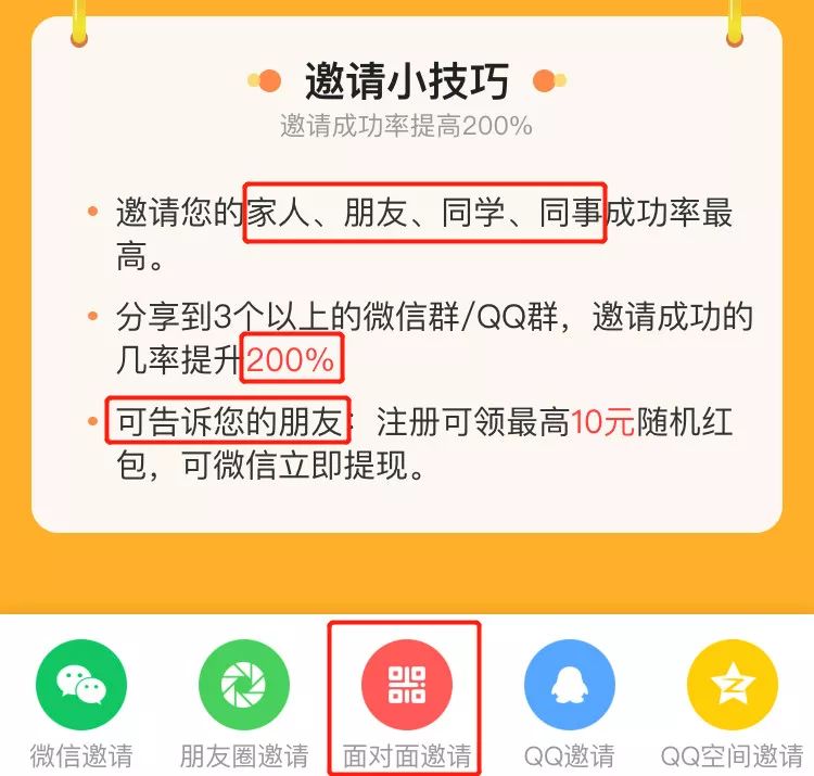 最后,提供了几条邀请小技巧,包括可以分享的人群(主要是家人和朋友)分享成功和分享话术。尤其强调了面对面邀请的方式,契合他们目标人群的社交模式。