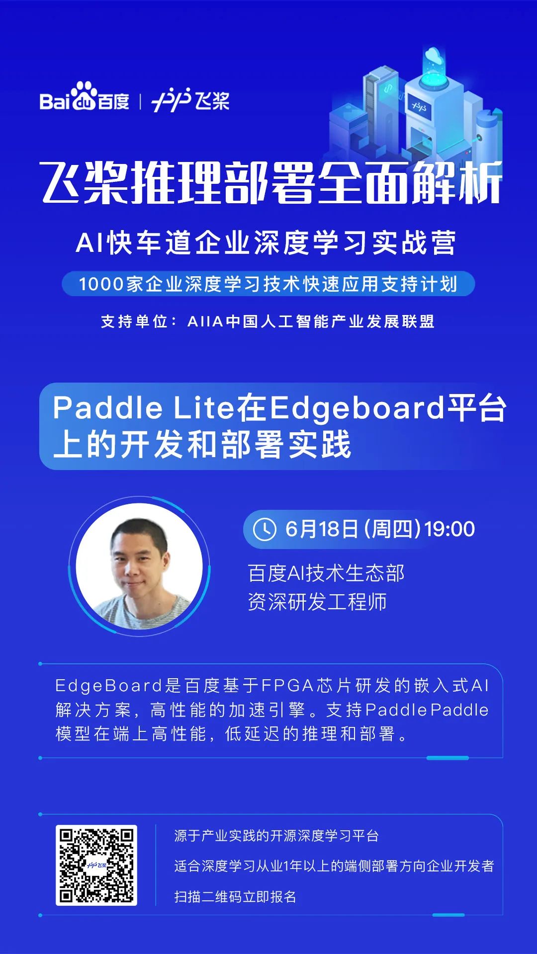 6月18日(周四)19:00-20:00,百度技术大咖们将为你带来包括AI应用开发流程的介绍,Edgeboard的优势和应用场景解析,Paddle Lite在Edgeboard上的部署实战,以及关于Edgeboard管理系统的详细介绍。当然,最后还有Q&A环节,你有任何问题都可以在直播间跟技术大咖一起探讨。如果你正需要这样一款高性能、高通用、易集成的便捷“加速器”,那么锁定本周的课程准没错!