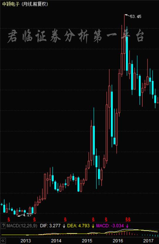 回看中颖电子的股价,你就会惊讶的发现,从上市后没多久的4.27元,至2016年底的53.45元,这个公司的股价已经在3年时间里实现了十倍股的荣耀。