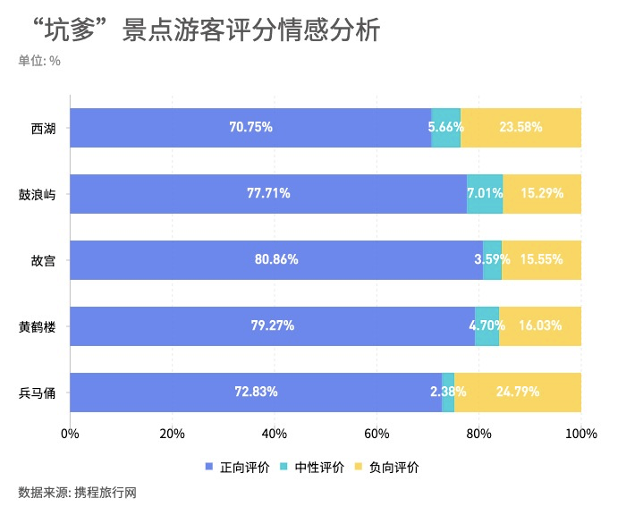 可以看到,虽然上一节的好评度分析中,每个景点都有超过8成的网友给出好评,但是从评价内容来看,给出正向的评价网友除了故宫之外,均不足8成,而整体评价较好的兵马俑,却有24.79%的网友给出负向评价。