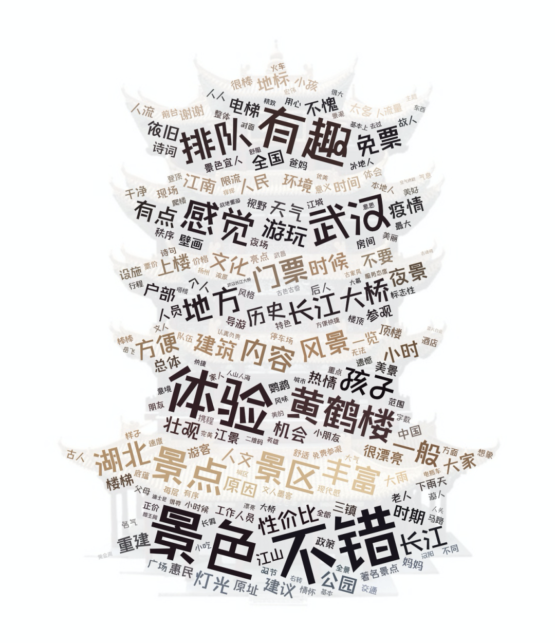 最后是黄鹤楼的词云,依旧是景色不错,因为坐落在湖北,疫情也被网友频频提起,免票更是引起好评,但是人多排队也是被网友吐槽👇