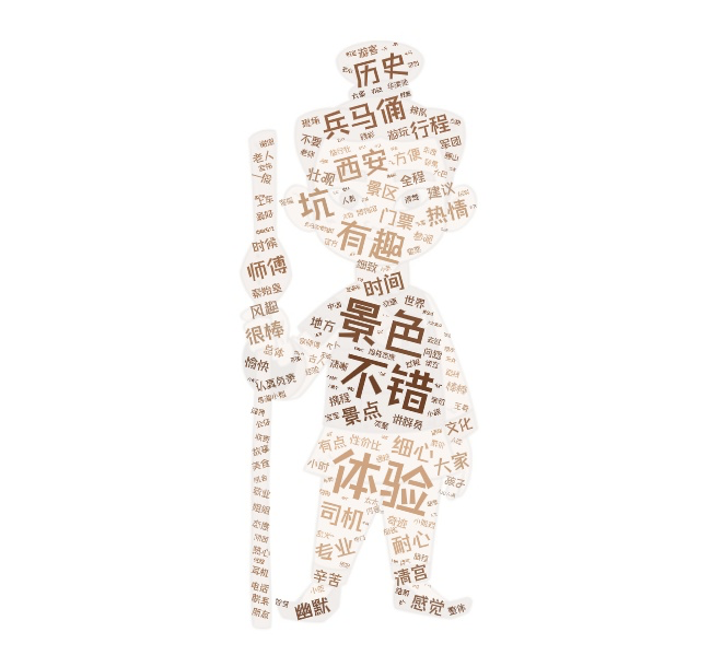 从下面兵马俑词云可以看到,除了景色不错,有一部分网友表示很坑,而由于兵马俑独特的历史气息,也有一部分网友在表扬园区内的讲解👇