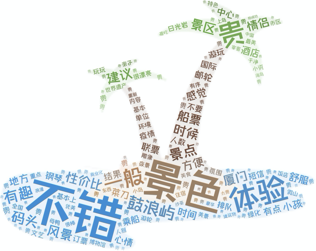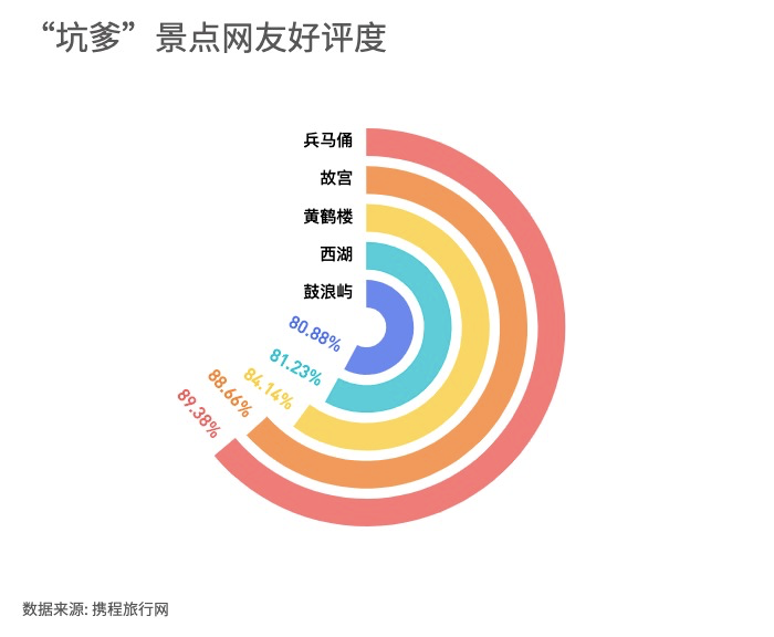 根据该网站数据,兵马俑和故宫分别斩获近9成网友的好评,而西湖和鼓浪屿的好评度仅在80%左右,黄鹤楼也有近85%的网友给出好评,当然这里的好评仅为网友给出的总分,可以视为整体评价,接下来将对具体的评论内容进行分析。