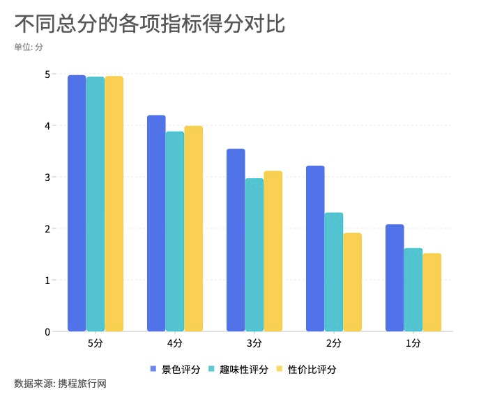 在我们采集到的数据字段中除了总得分(好评)之外,还有景色、趣味、性价比三个指标,现在看一下不同总分的各项指标得分对比