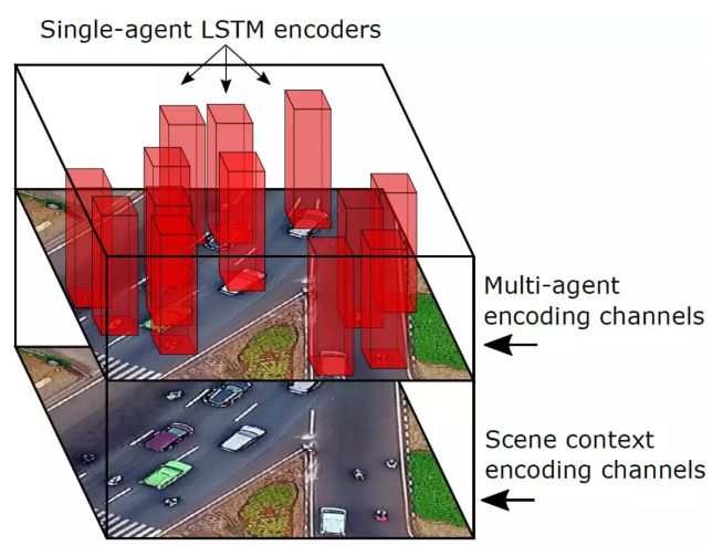 MAT 编码是一个鸟瞰视角的静态场景和动态多智能体的特征图(Feature Map),包括多智能体编码通道(Multi-Agent Encoding Channels)(上)和静态场景编码通道(Scene Context Encoding Channels)(下)。单智能体长短时记忆网络(Single Agent LSTM)编码器输出的多智能个体特征向量(红色)在空间上根据这些智能体的坐标对齐,构造出多智能体编码通道。多智能体编码通道与静态场景编码通道(场景编码全卷积网络的输出特征图)对齐,以保持智能体与场景间的空间结构。