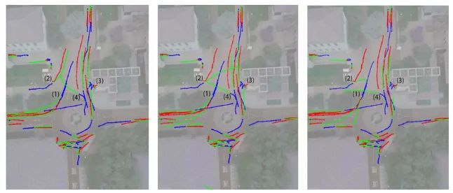 MATF 多智能体-场景推断模型正确预测了这些和其他各种场景的轨迹情形,其中一些情形也被 MATF 多智能体-无场景推断模型近似地预测了出来,但大多数情形都没有被基准的 LSTM 模型预测出来。